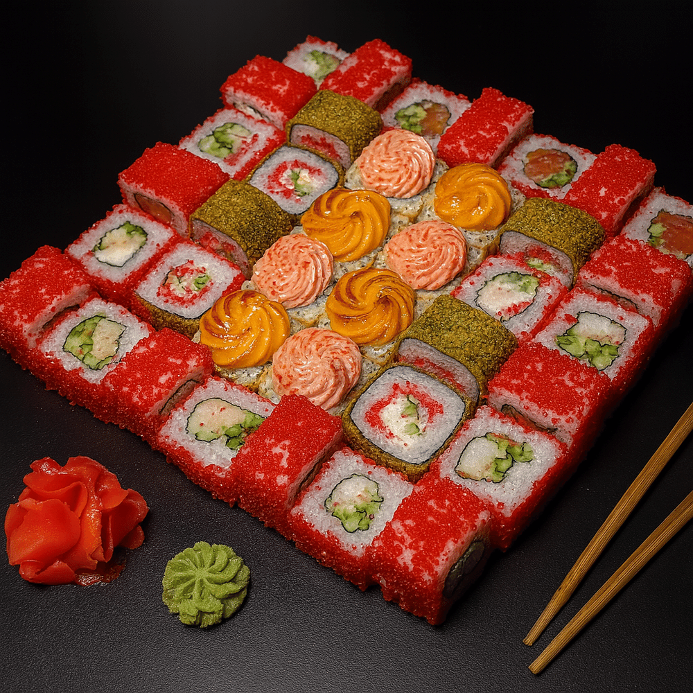 Калифорния темпура; Калифорния запеченная; Калифорния с лососем; Калифорния с креветкой; Калифорния с угрём В данный сет мы положим 4 набора палочек, 120 грамм соевого соуса, 40 грамм имбиря, 20 грамм васаби и лимон
