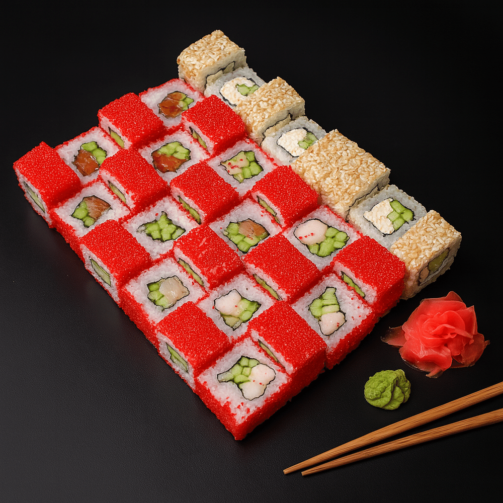 Калифорния в кунжуте; Калифорния с лососем; Калифорния с креветкой; Калифорния с угрём В данный сет мы положим 2 набора палочек, 60 грамм соевого соуса, 30 грамм имбиря, 10 грамм васаби и лимон