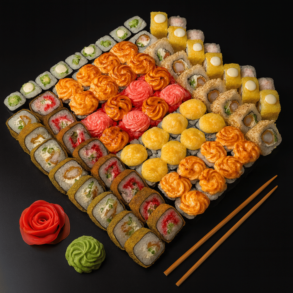 Сырный; Дон Бекон; Лава с Мидиями; Канада; Изумидай; Калифорния темпура; Крейзи чиз; Цезарь с Курицей; Огурец; Чука; Краб В данный сет мы положим 5 наборов палочек, 150 грамм соевого соуса, 70 грамм имбиря, 25 грамм васаби