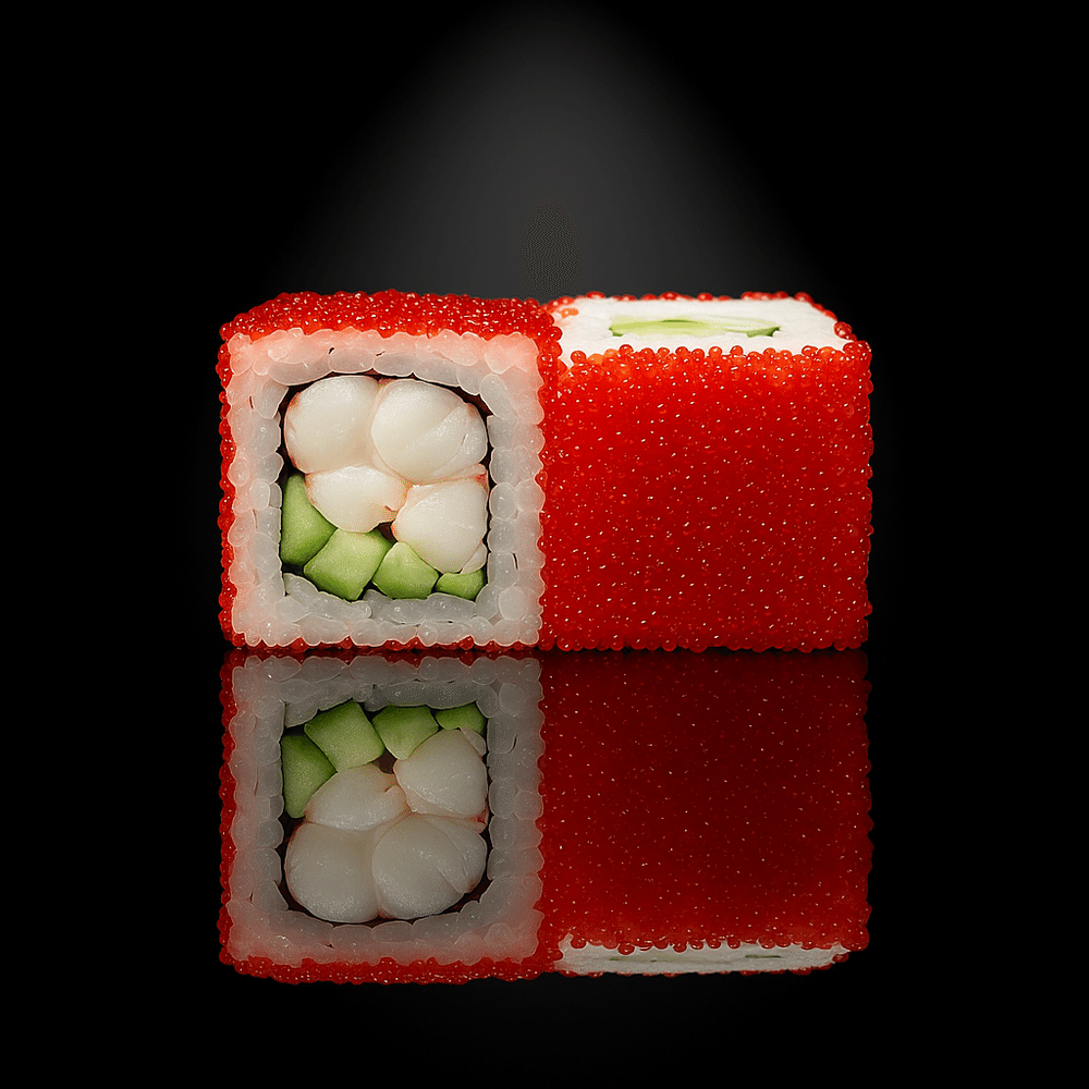 Рис, водоросли нори, огурец, масаго красная, креветка тигровая