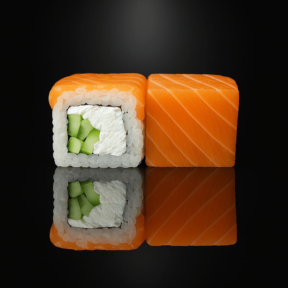 Рис, водоросли нори, огурец, сливочный сыр, лосось