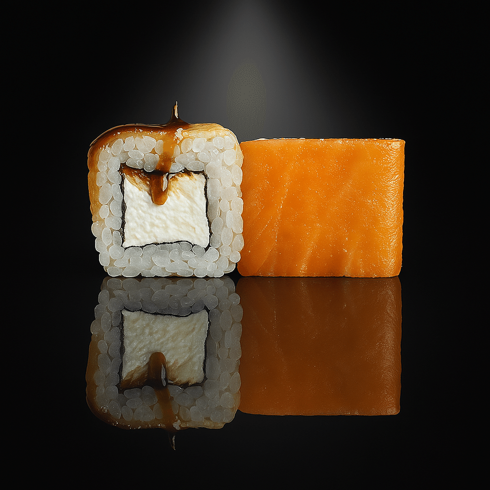 Рис, водоросли нори, масаго оранжевая, сливочный сыр, угорь, лосось, унаги соус, кунжут микс