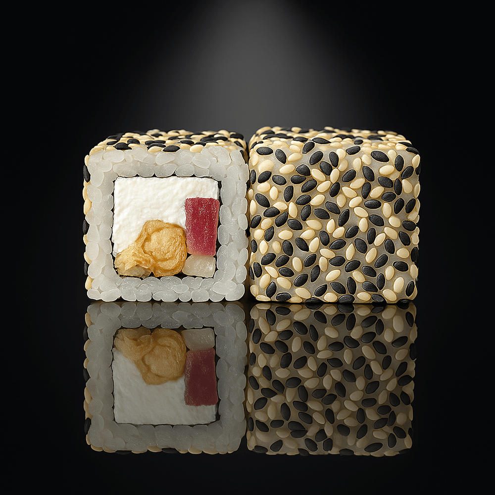 Рис, водоросли нори, сливочный сыр, мидии салатные, помидор, кунжут микс