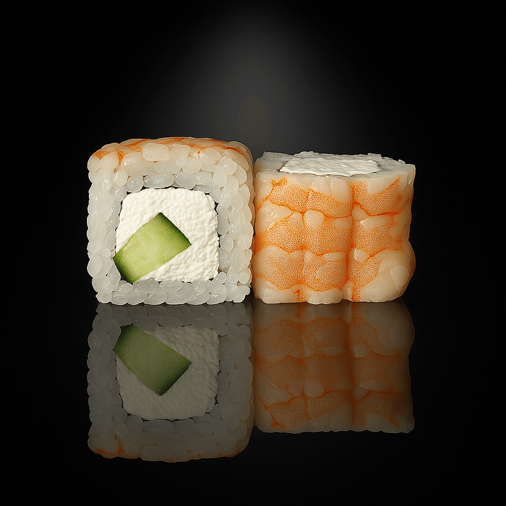 Рис, водоросли нори, сливочный сыр, креветка, огурец