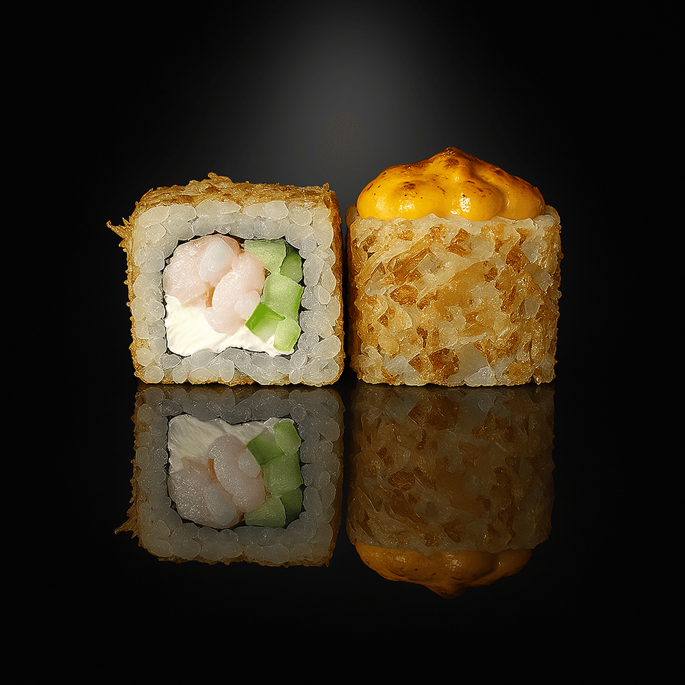 Рис, водоросли нори, стружка тунца, сливочный сыр, креветка тигровая, огурец, соус на выбор