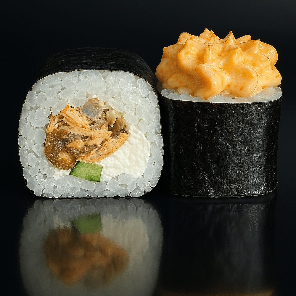 Рис, водоросли нори, мидии салатные, сливочный сыр, огурец , соус Юко