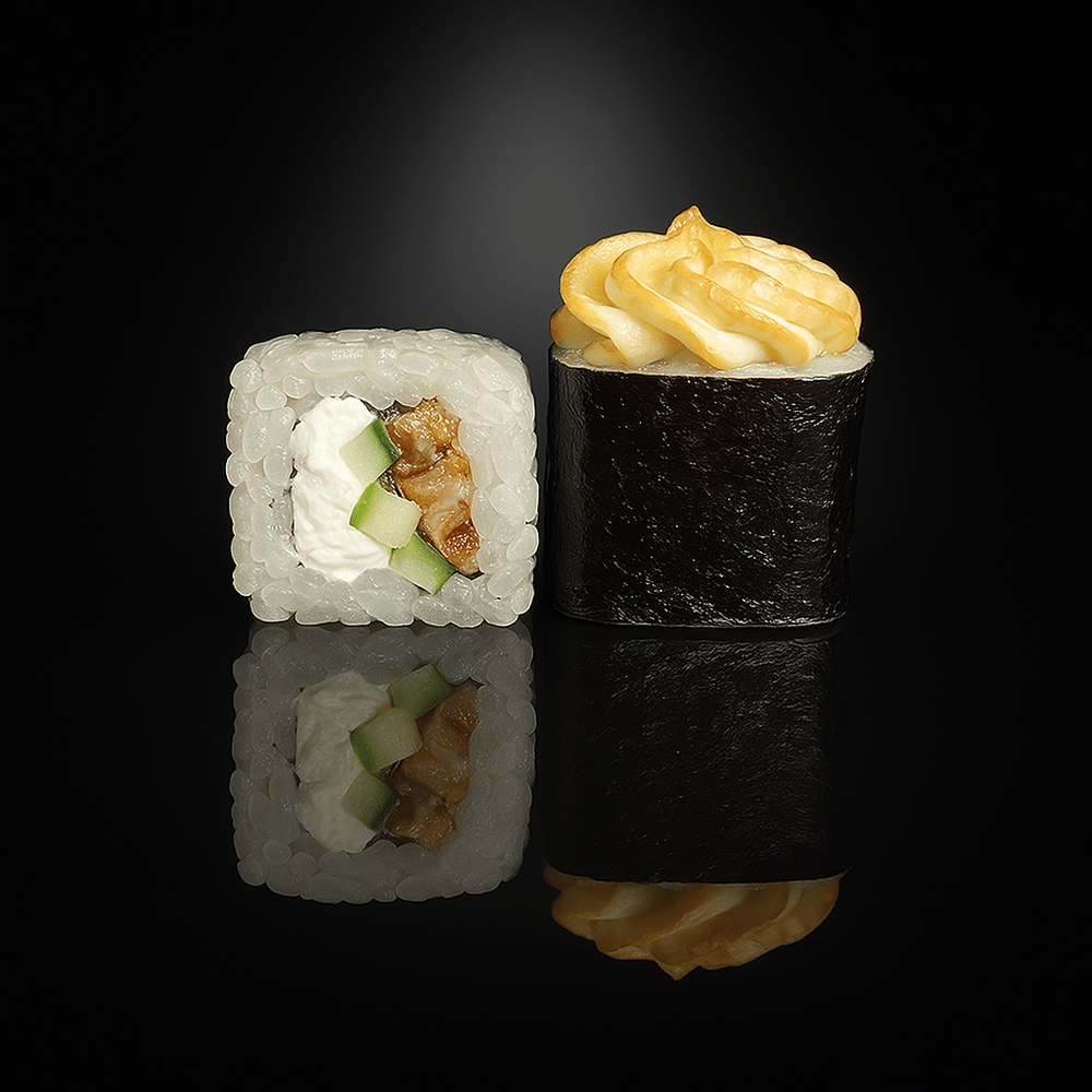 Рис, водоросли нори, сливочный сыр, угорь, огурец , соус юко