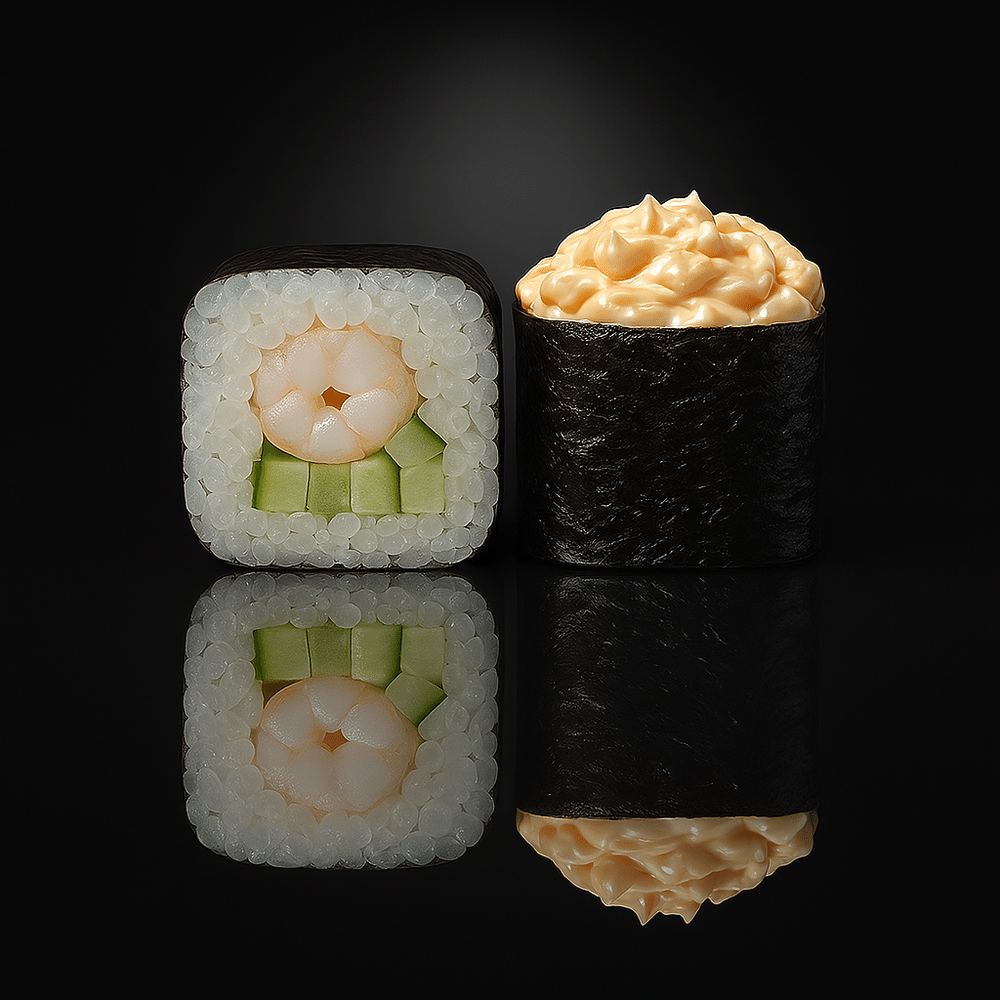 Рис, водоросли нори, креветка тигровая, огурец , соус Юко