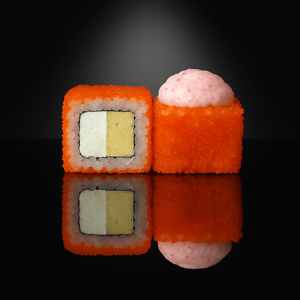 Рис, водоросли нори, сливочный сыр, блин томаго, масаго оранжевая, краб-крем, соус яки