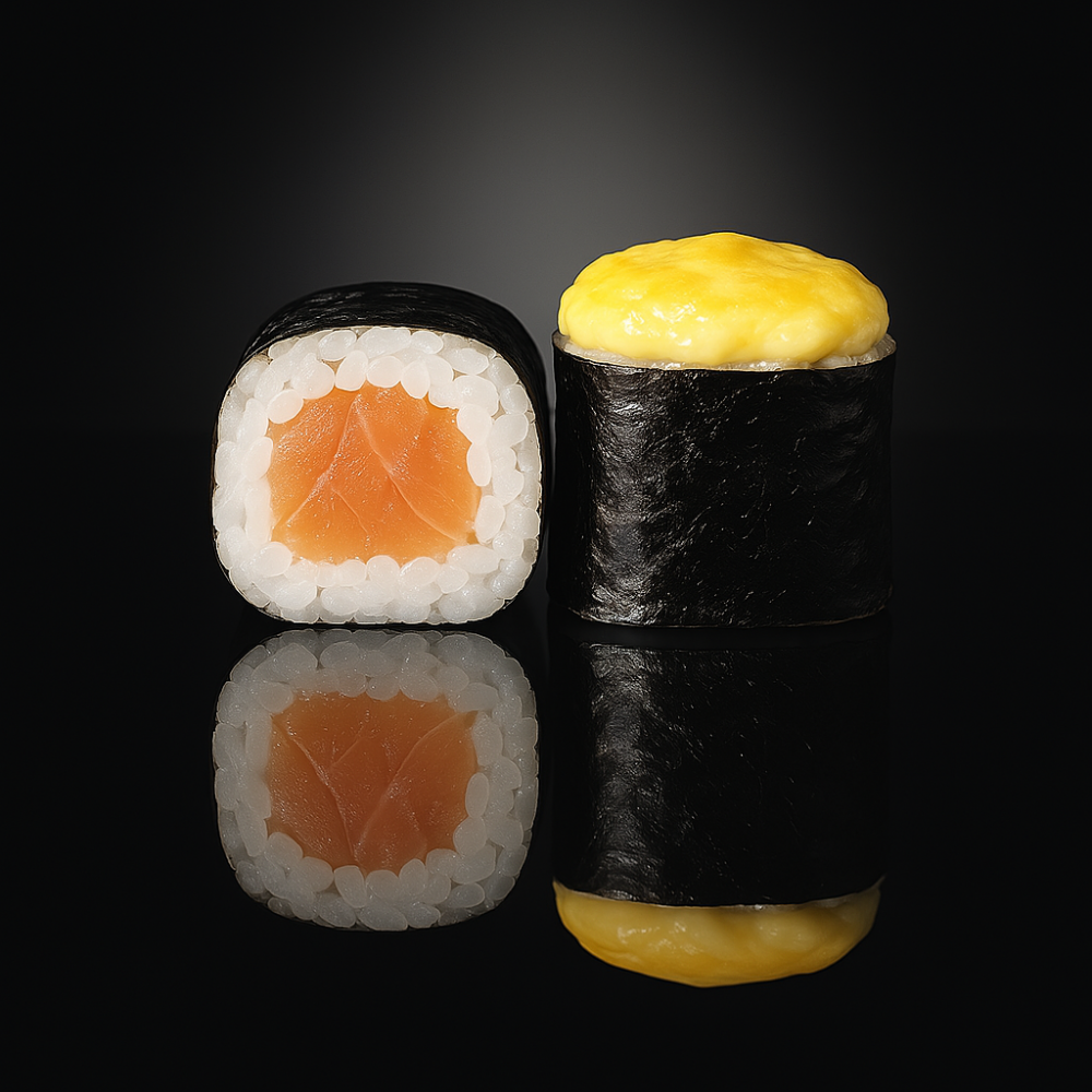Рис, водоросли нори, лосось, соус сырный