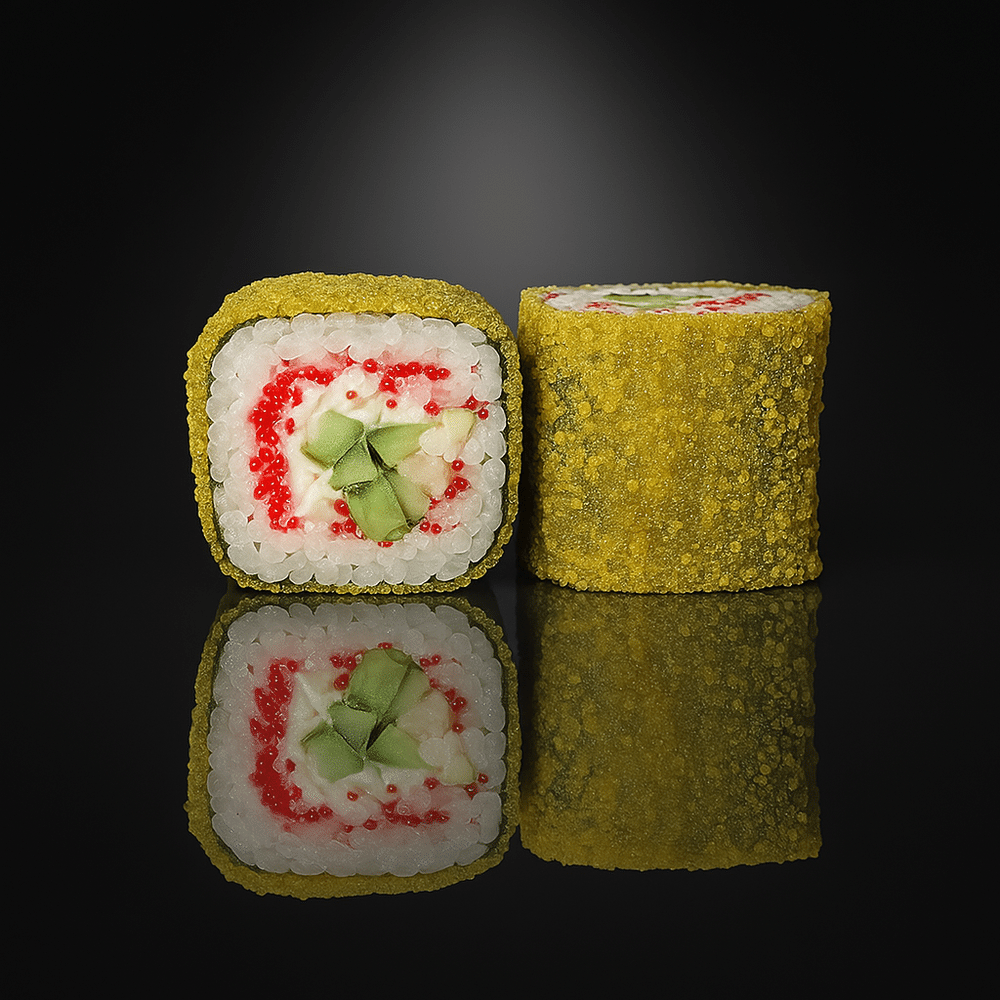 Рис, водоросли нори, краб-крем, огурец, масаго красная, кляр, сухари панировочные