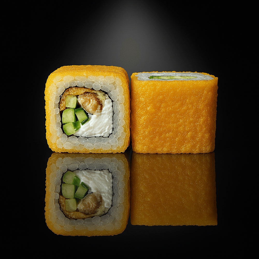 Рис, водоросли нори, сливочный сыр, огурец, мидии салатные, кляр, сухари панировочные