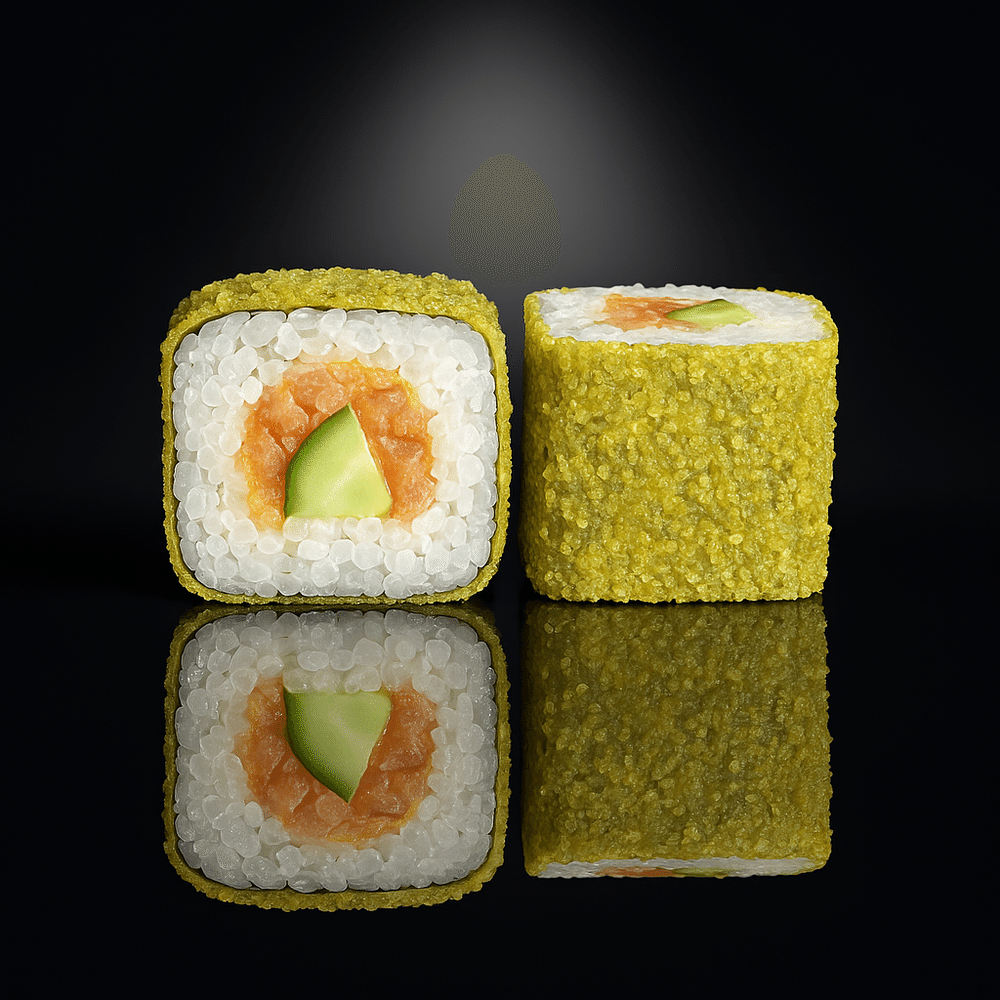 Рис, водоросли нори, лосось, огурец, масаго оранжевая, кляр, сухари панировочные