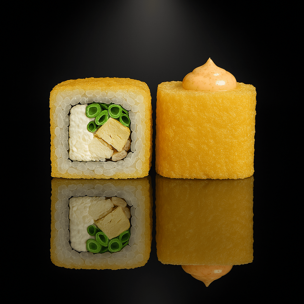Рис, водоросли нори, сливочный сыр, блин томаго, лук зелёный, кляр, сухари панировочные, спайси соус
