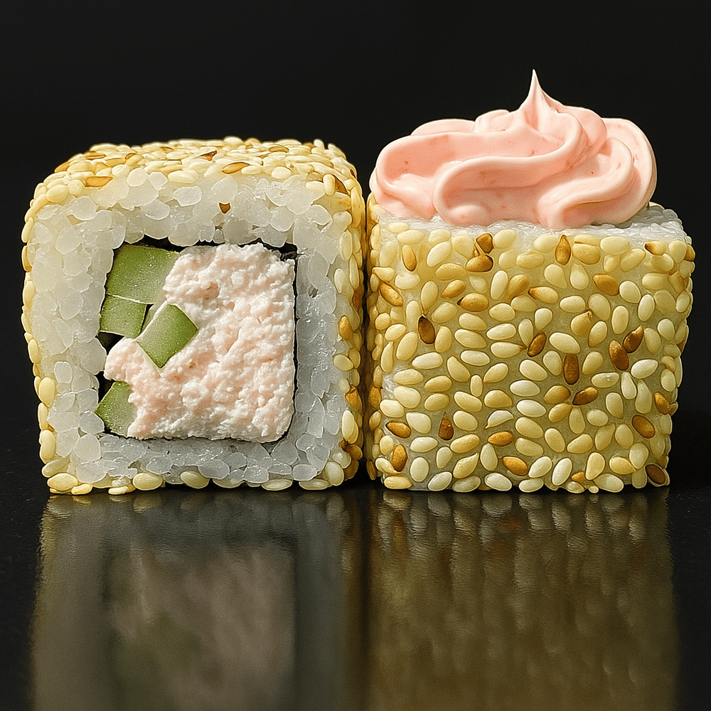 Рис, водоросли нори, краб-крем, огурец, кунжут белый, соус на выбор