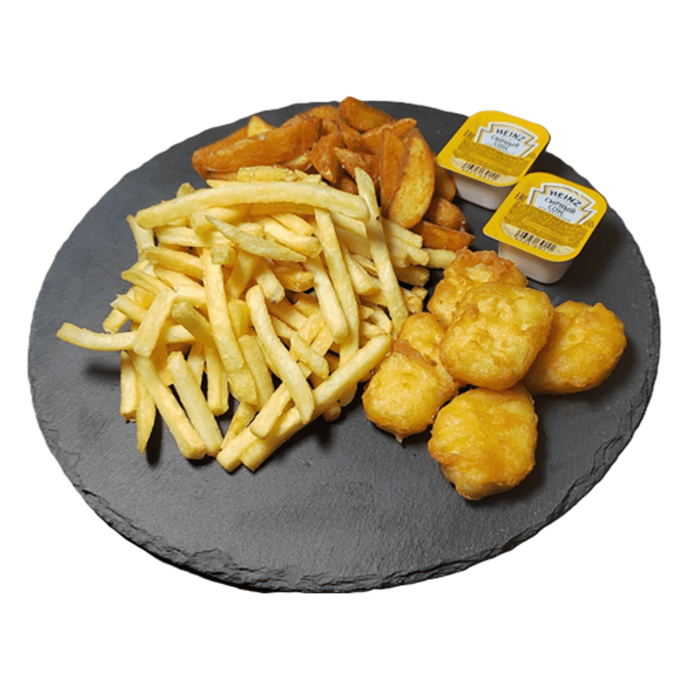 Картофель фри 150гр, Картофельные дольки 150гр, Наггетсы 5шт, 2 сырных соуса