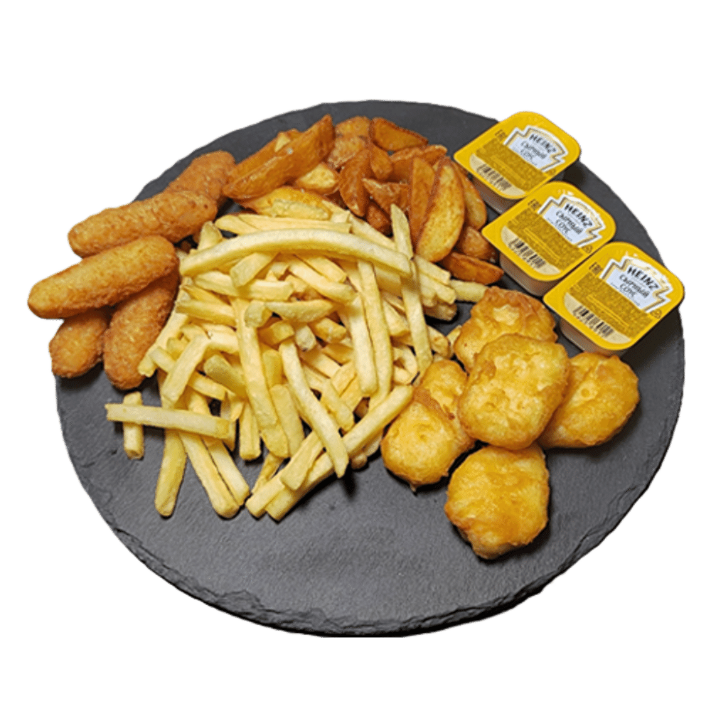 Картофель фри 300гр, Картофельные дольки 150гр, Наггетсы 5шт, Сырные палочки 5шт, 3 сырных соуса