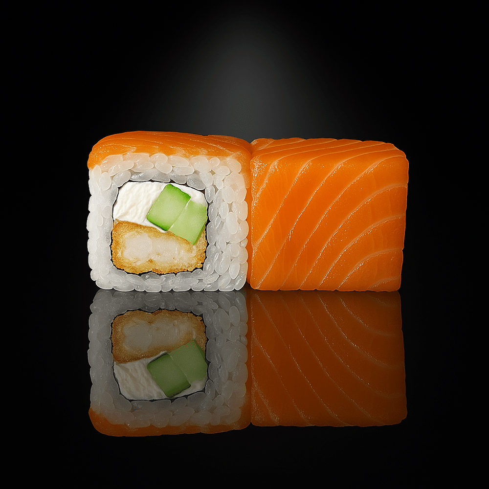 Рис, водоросли нори, огурец, сливочный сыр, лосось, окунь темпура