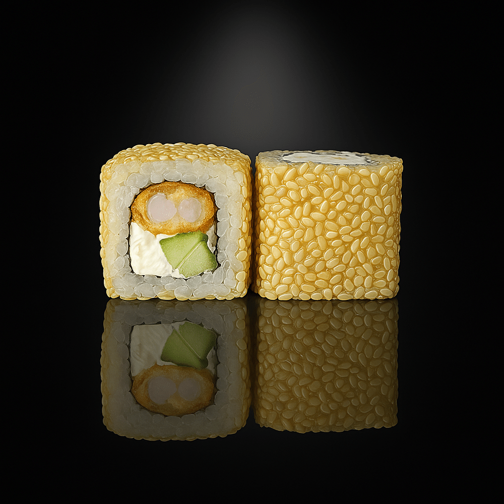 Рис, водоросли нори, креветка темпура, сливочный сыр, огурец , кунжут