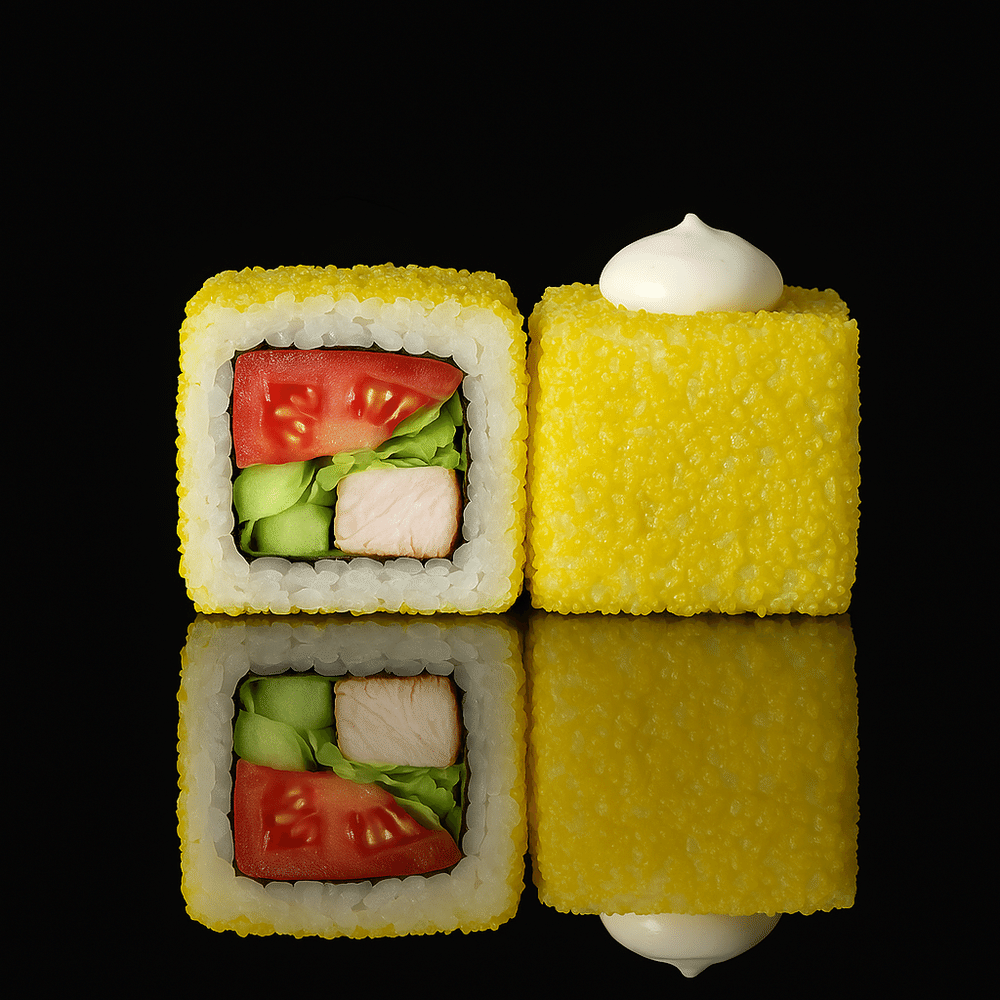 Рис, водоросли нори, курица копченная, салат айсберг, огурец ,помидор, сухари панировочные, соус цезарь