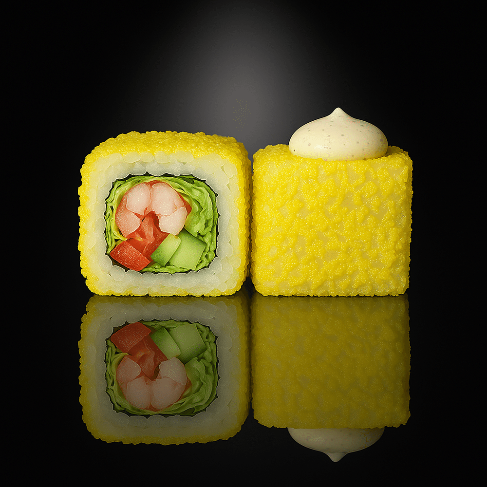 Рис, водоросли нори, креветка, салат айсберг, огурец ,помидор, сухари панировочные, соус цезарь