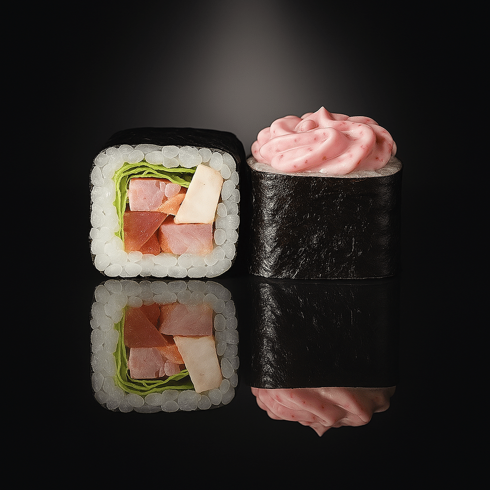 Рис, водоросли нори, бекон, курица копчённая ,салат айсберг, помидор, соус на выбор