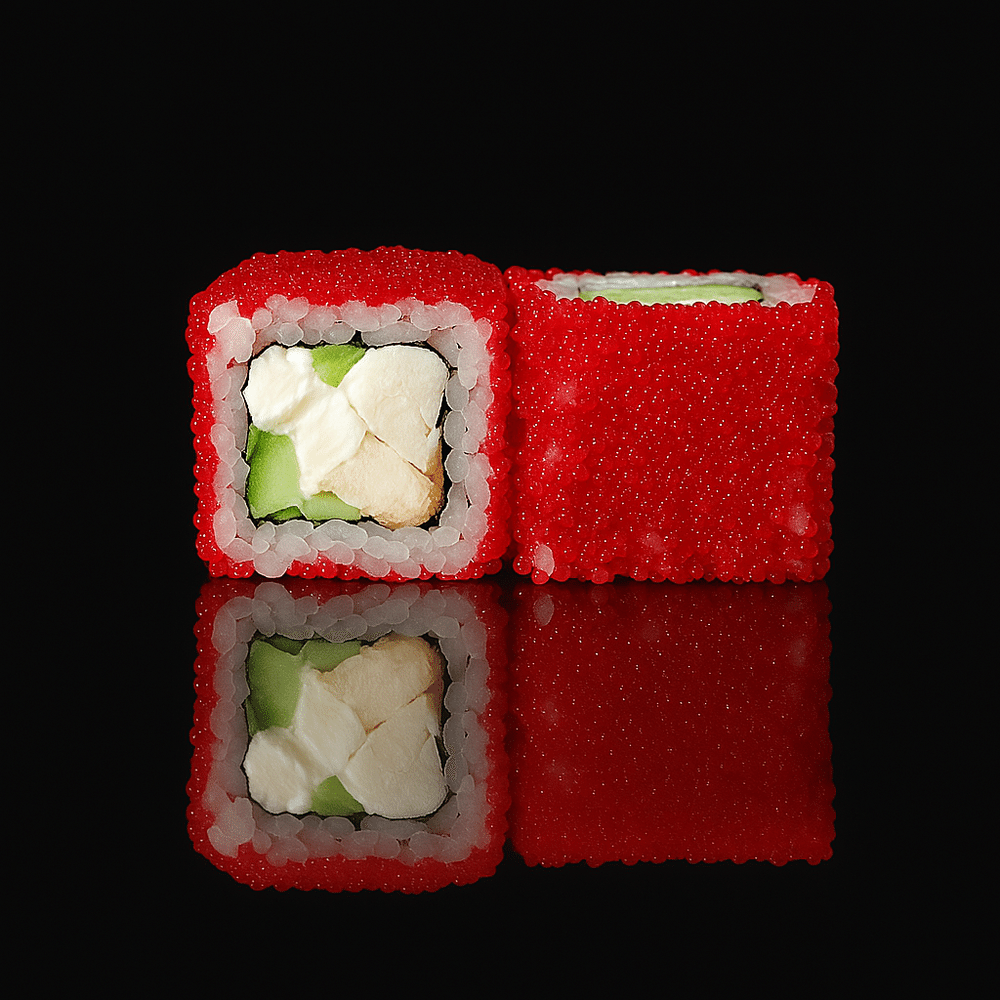 Рис, водоросли нори, курица копченная, сливочный сыр, огурец, масага красная