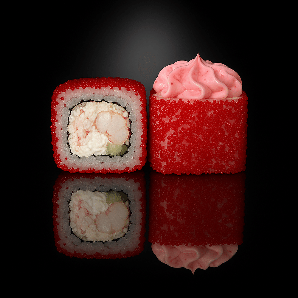 Рис, водоросли нори, сливочный сыр, креветка тигровая, масаго красная, краб-крем, огурец, соус на выбор