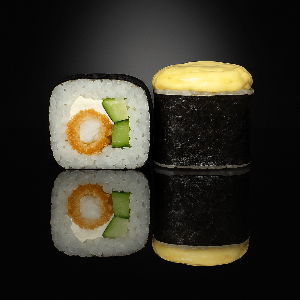 Рис, водоросли нори, сливочный сыр, окунь темпура, огурец, соус сырный