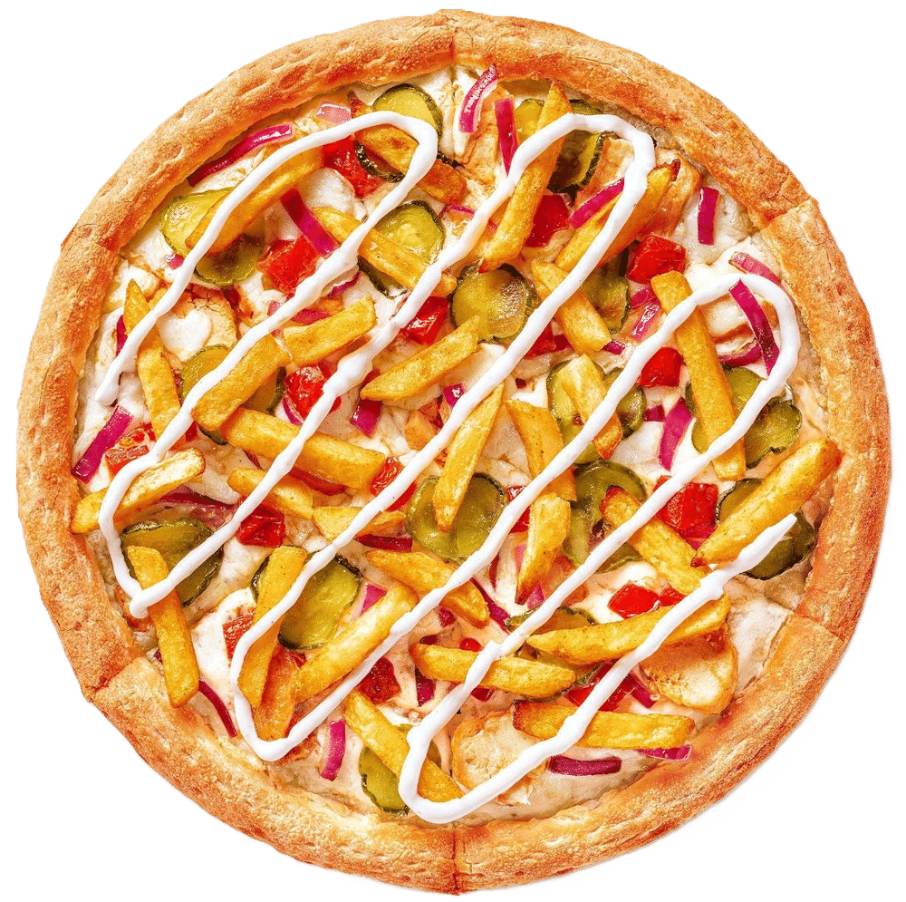 Вкуснейшее тесто, сыр моцарелла, томатный соус, помидор, бекон, огурцы солёные, лук красный, картофель фри, чесночный соус
