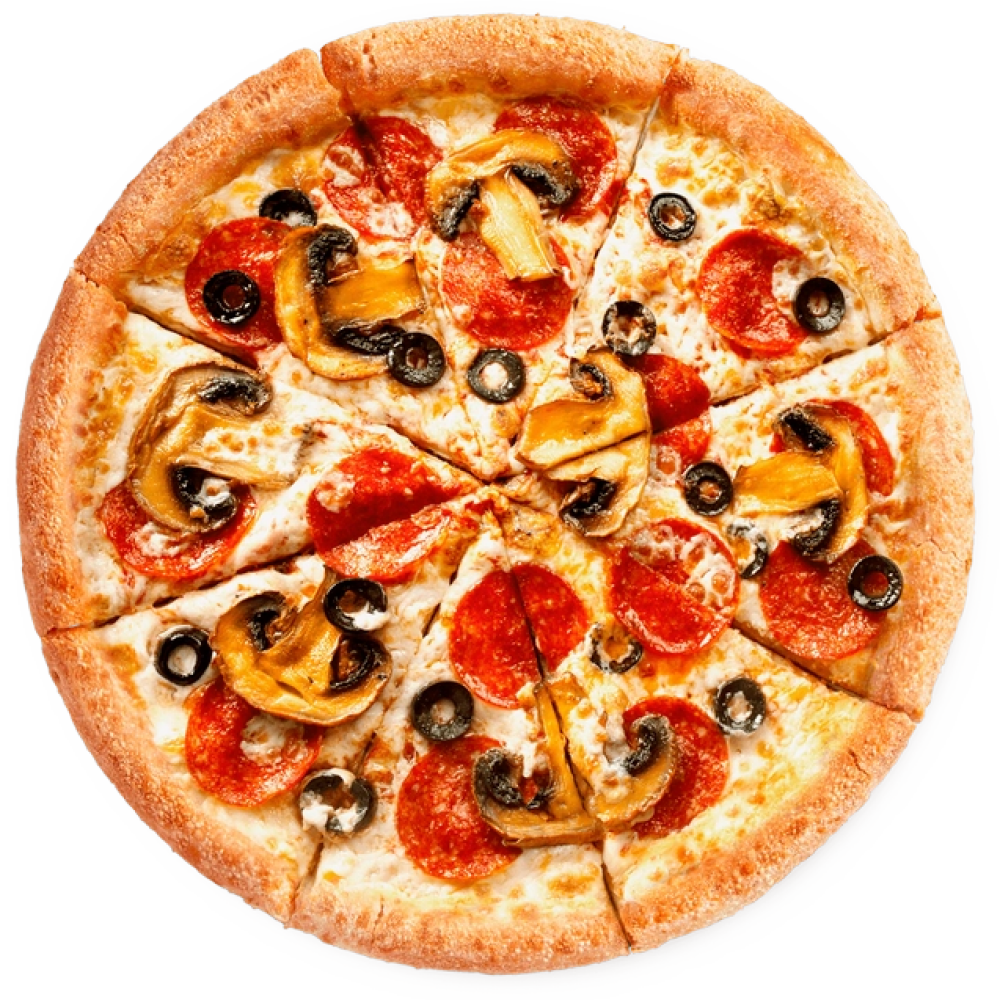 Вкуснейшее тесто, сыр моцарелла, томатный соус, пепперони, грибы шампиньоны, маслины, орегано