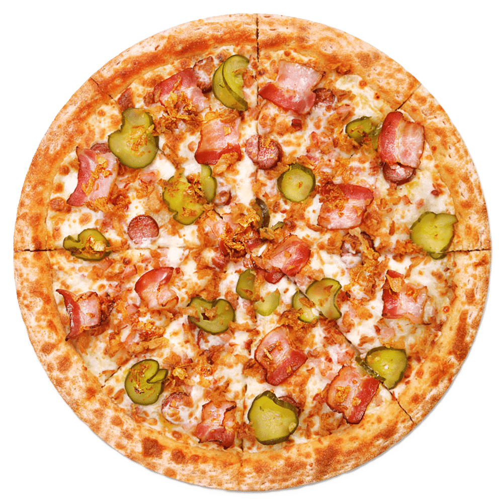 Вкуснейшее тесто, сыр моцарелла, горчичный соус, охотничьи колбаски, бекон, соленые огурцы, лук фри, орегано
