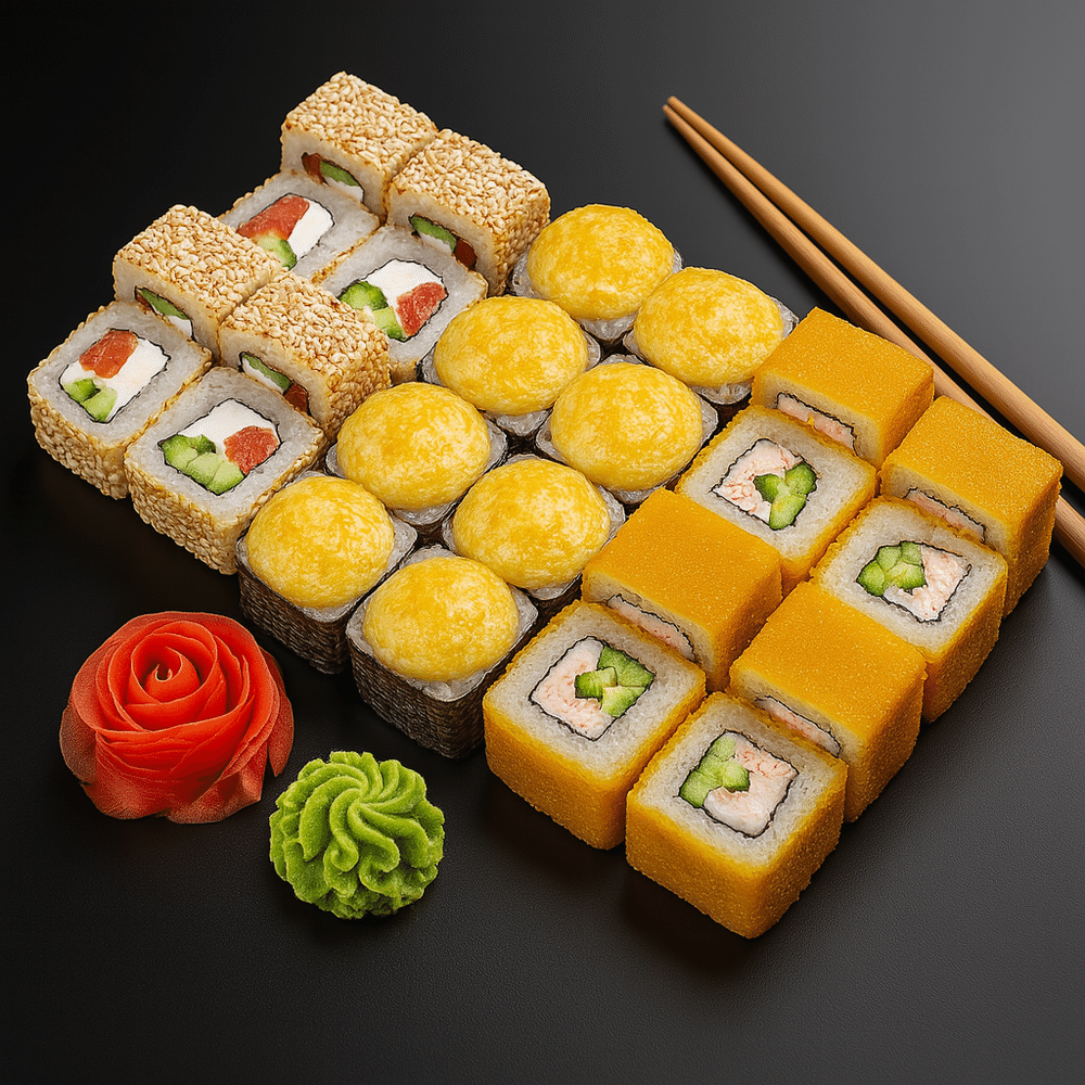 Филадельфия в кунжуте, Сырный, Эби кани темпура В данный сет мы положим 2 набора палочек, 60 грамм соевого соуса, 30 грамм имбиря, 10 грамм васаби и лимон
