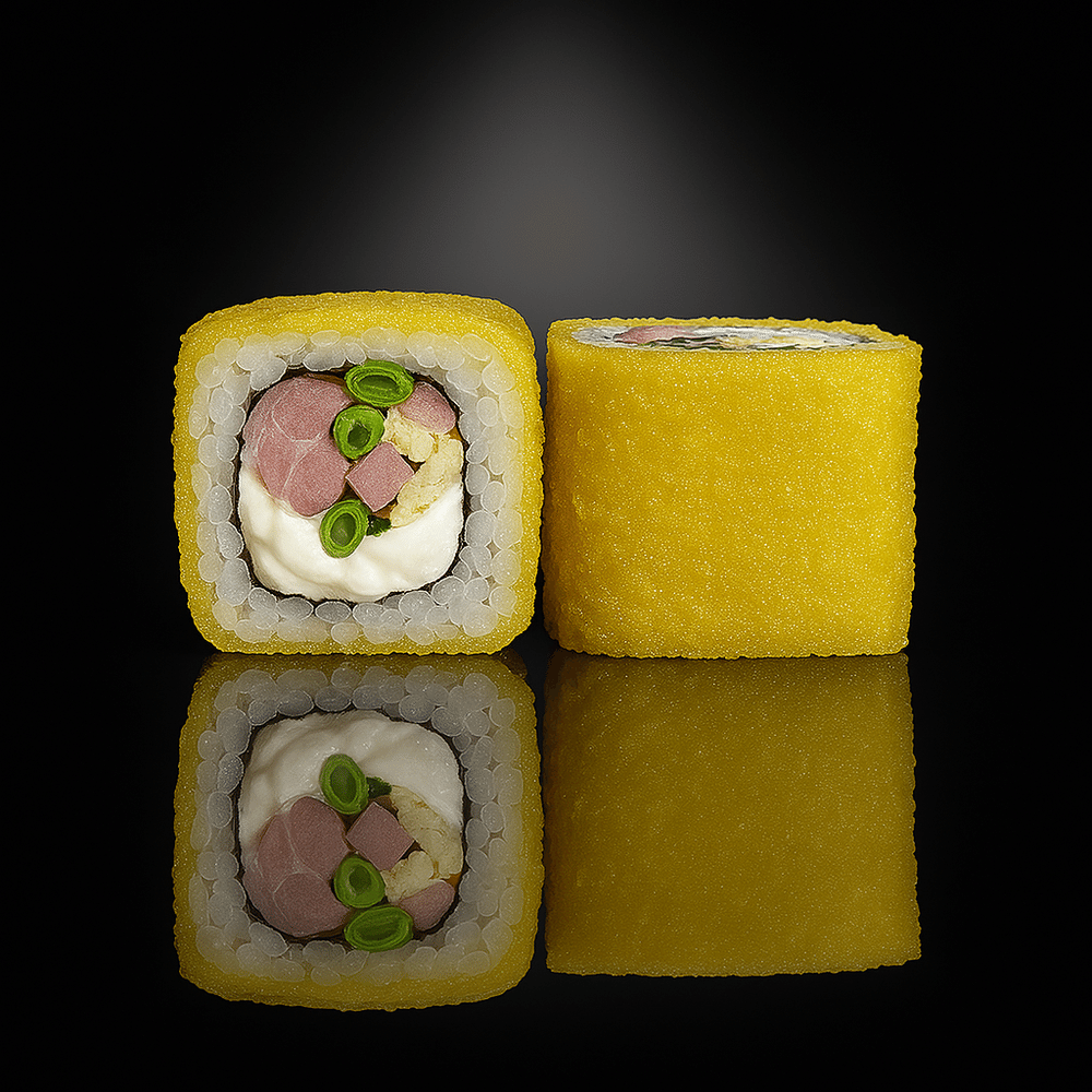 Рис, водоросли нори, сливочный сыр, бекон, блин томаго, лук зеленый, кляр, сухари панировочные