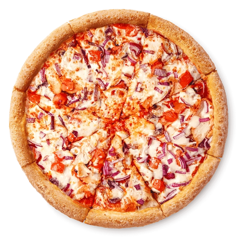 Вкуснейшее тесто, сыр моцарелла, курица копченная, фирменный соус на основе том ям, помидор, грибы шампиньоны, лук фиолетовый, орегано