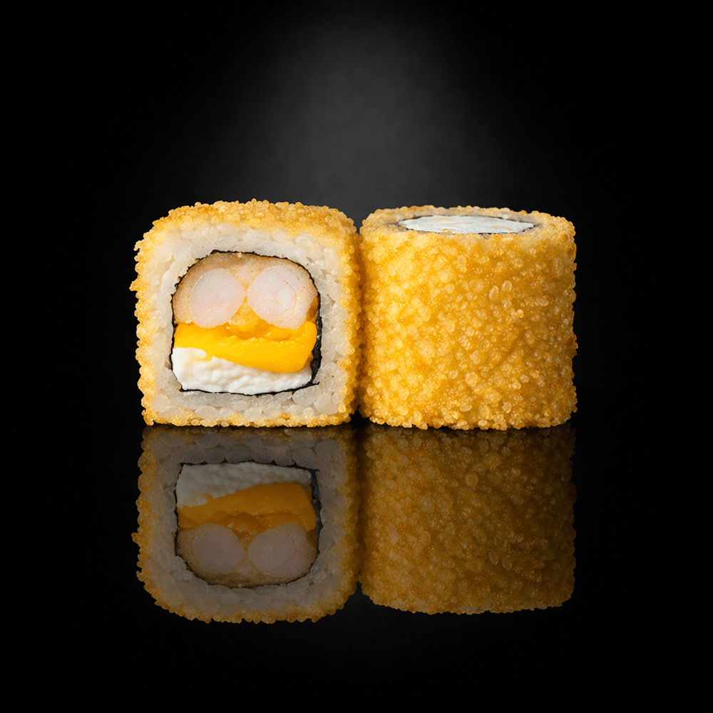 Рис, водоросли нори, сливочный сыр, креветка тигровая, сыр чеддер, кляр, сухари панировочные