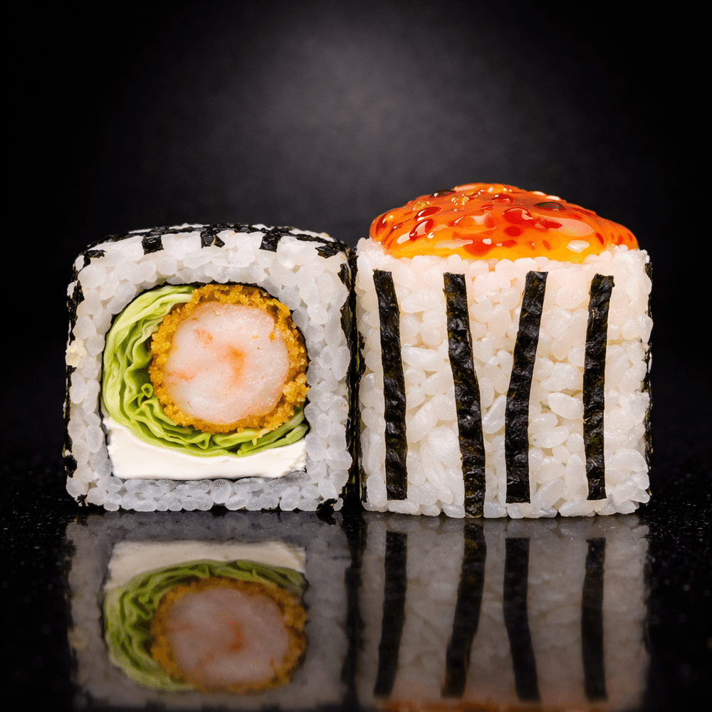 Рис, водоросли нори, креветка темпура, сливочный сыр, салат айсберг , соус свит чили, лук фри