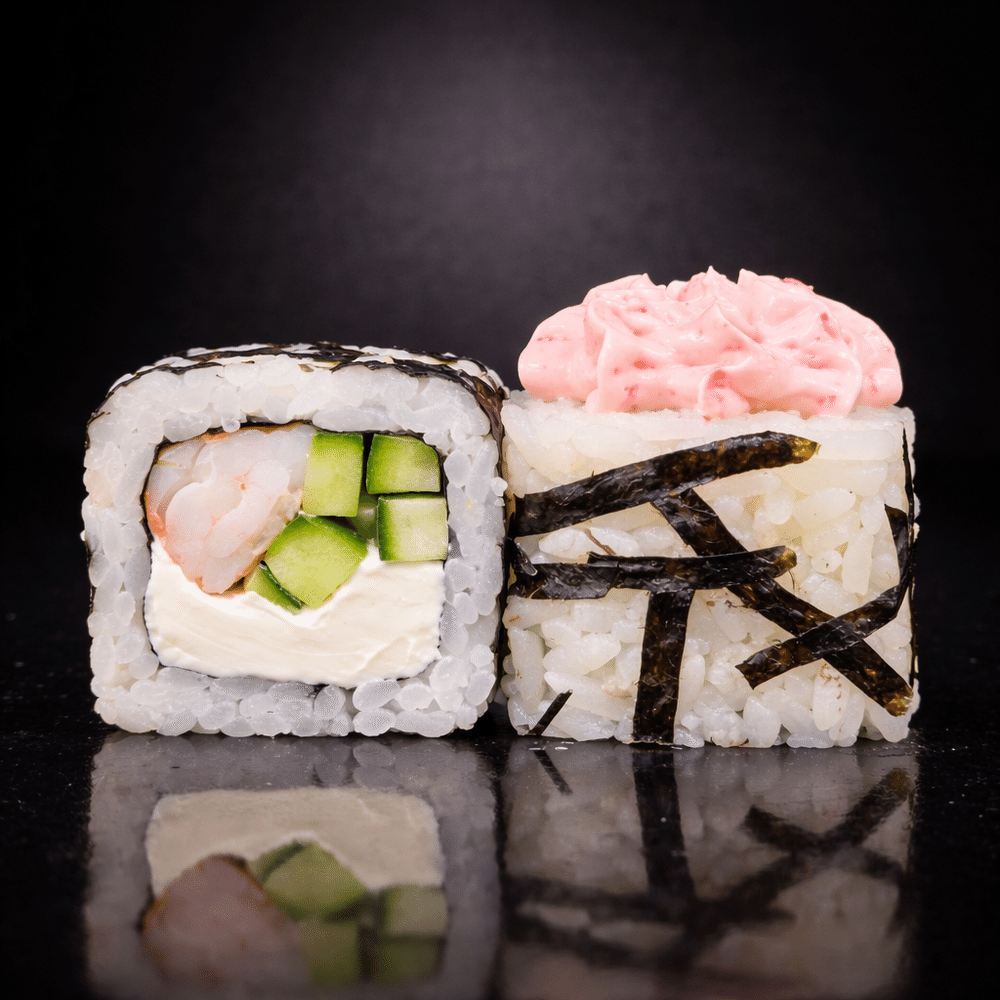 Рис, водоросли нори, креветка тигровая, сливочный сыр, огурец, соус яки