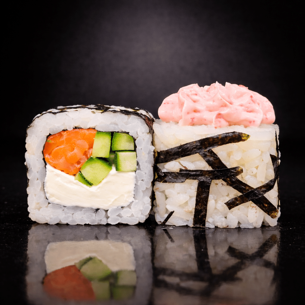 Рис, водоросли нори, лосось, сливочный сыр, огурец, соус яки
