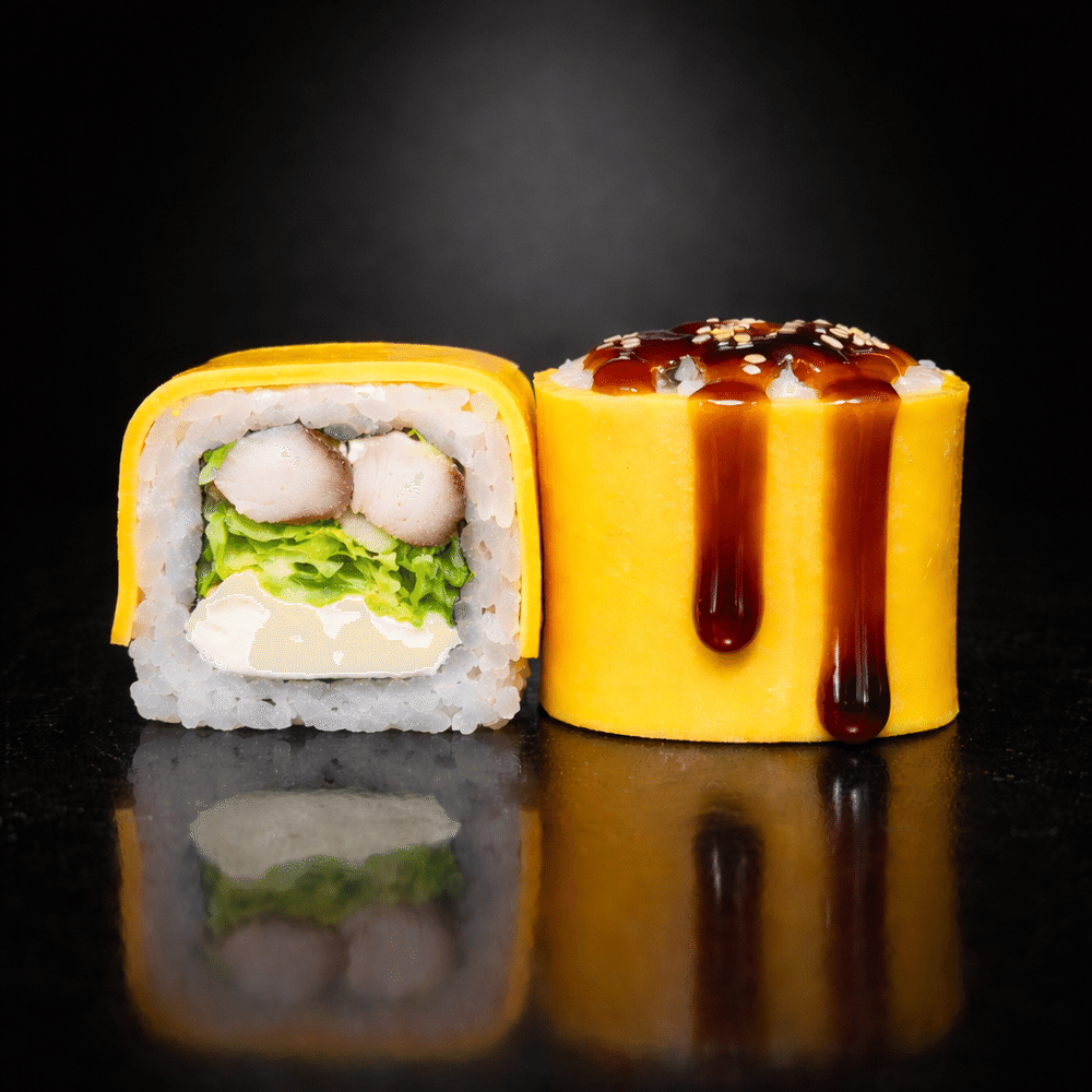 Рис, водоросли нори, сливочный сыр, курица копченная, салат айсберг, сыр чеддер, соус унаги
