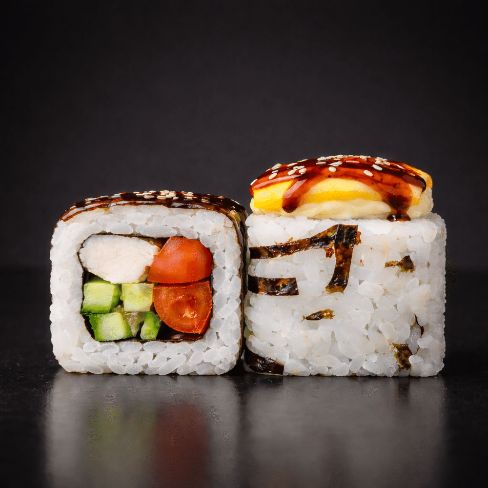 Рис, водоросли нори, курица копчённая, помидор, огурец, соус сырный, сыр чеддер, унаги соус