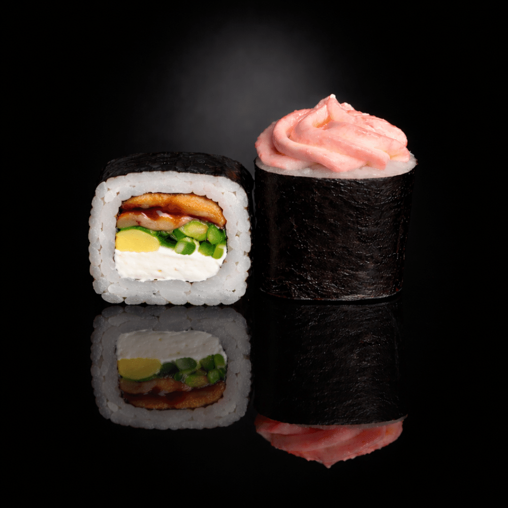 Рис, водоросли нори, сливочный сыр, угорь, блин томаго, лук зеленый, соус на выбор, соус унаги