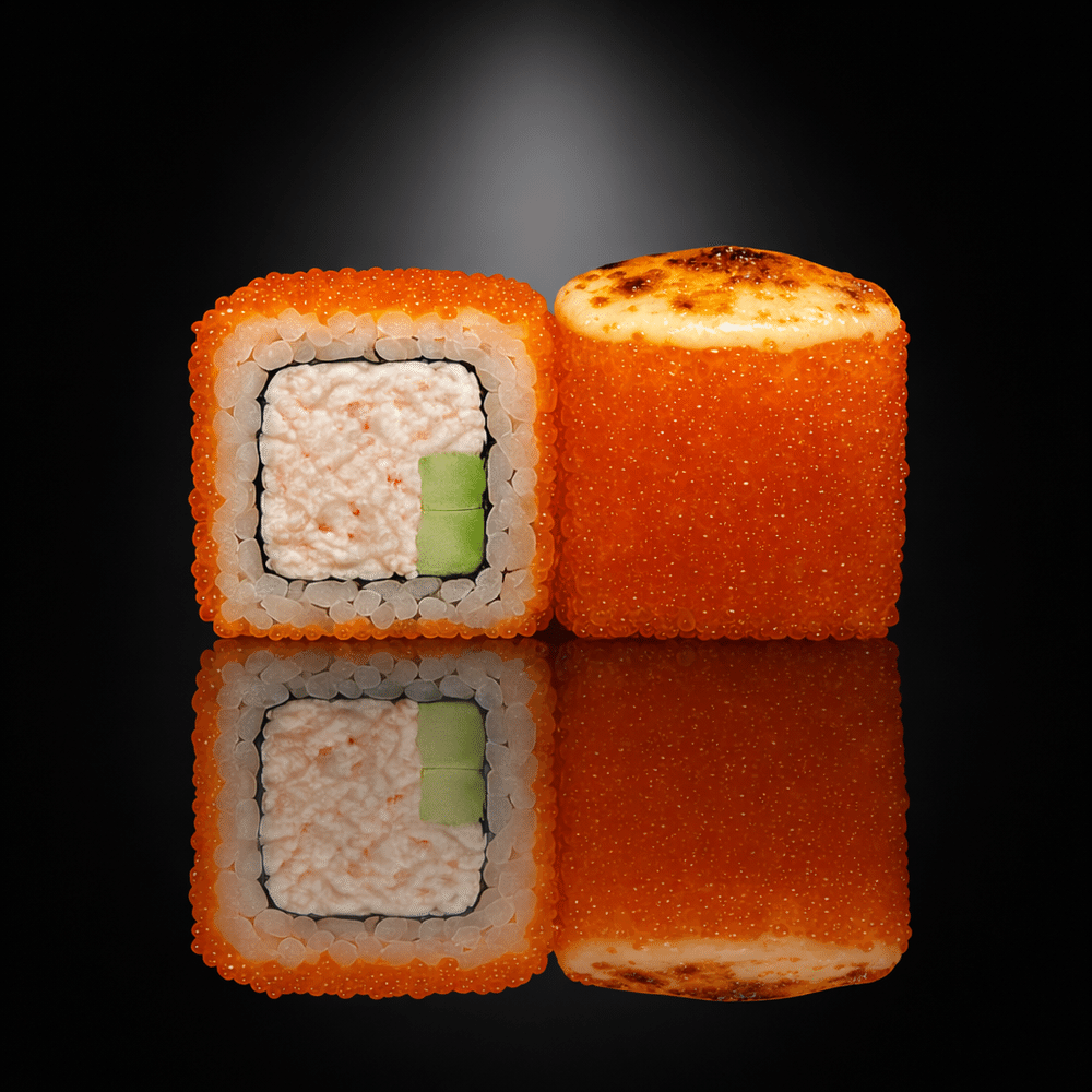 Рис, водоросли нори, огурец, масаго оранжевая, крем-краб, соус сырный