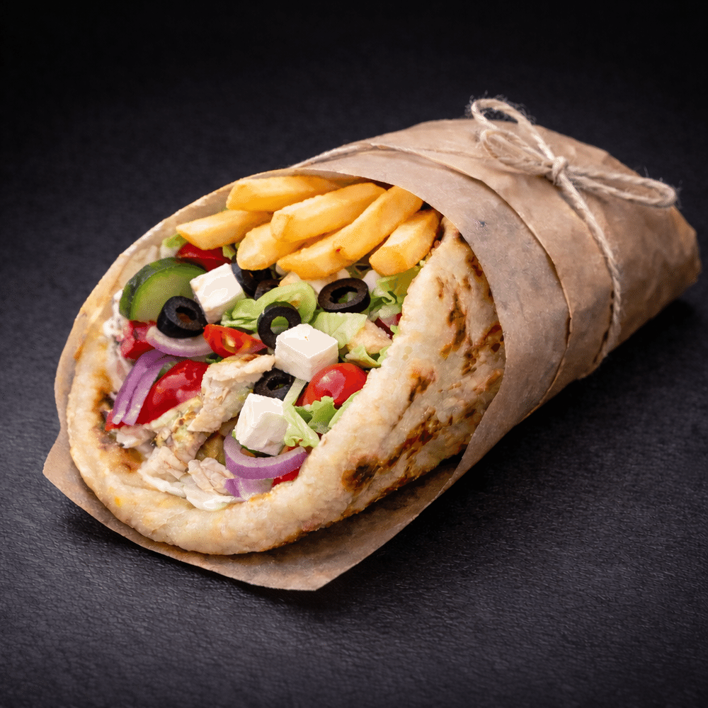 Пита, лук красный, салат айсберг, огурец, помидор, маслины, сыр фета, соус белый, курица, картофель фри, лук красный
