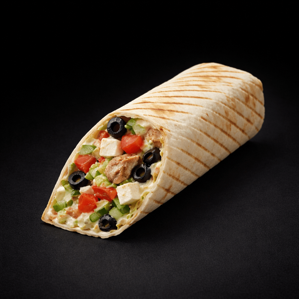 Лаваш, огурец, салат айсберг, сыр фета, помидор, соус белый, маслины, курица, лук красный