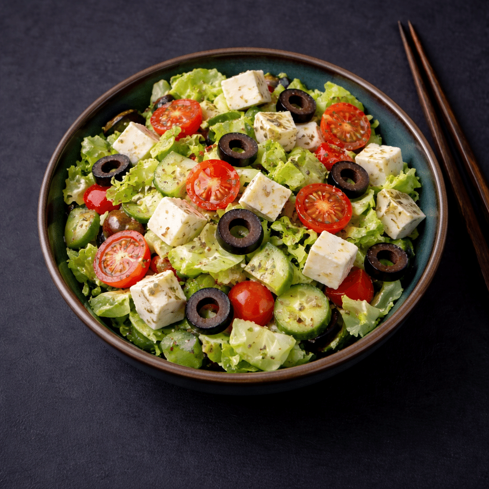 Салат Айсберг, томаты черри, соус бальзамический, маслины, перец болгарский, лук красный, сыр фета, огурец, орегано