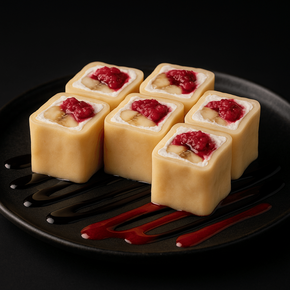 Спринг тесто, банан, вишня, сливочный сыр, сахарная пудра, топпинги клубничный и шоколадный