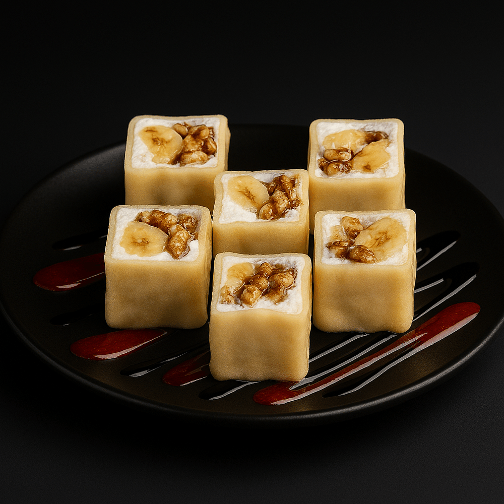 Спринг тесто, грецкий орех, мёд, банан, сливочный сыр, сахарная пудра, топпинги клубничный и шоколадный